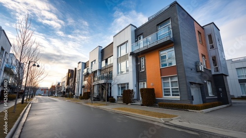 © Jersco, Fototapeta premium Modern townhouses line a residential street under a partly cloudy sky.