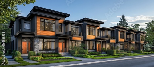 Naklejka premium Modern townhouses with orange accents and landscaped yards.