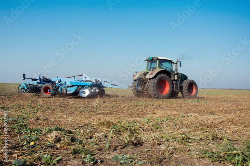© zorandim75, Obraz premium Modern tractor in a field on a sunny day. Tractor preparing land for sowing