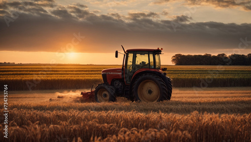 © Digital Art Studio, Fototapeta premium Modern tractor plowing at the sunset background. Generative Ai