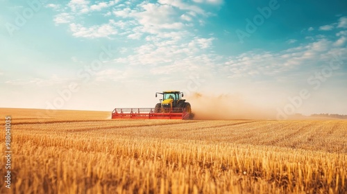 © Naknakhone, Obraz premium Modern tractors and equipment working efficiently in a large field.