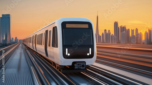 Naklejka premium Modern train cruising through city skyline at sunset, showcasing urban transport