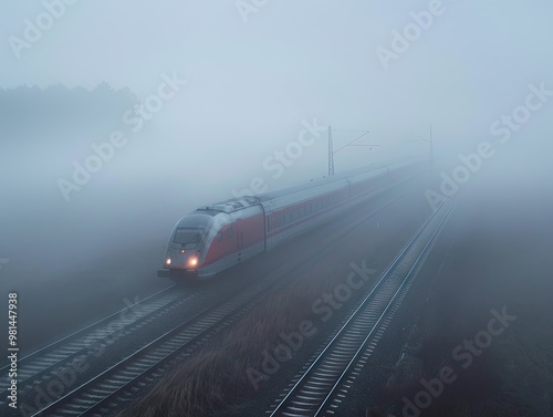 Naklejka premium Modern train emerging from fog on a tranquil morning.