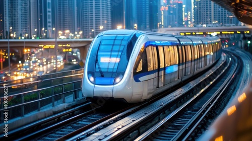 Naklejka premium Modern Train in Urban Cityscape at Night