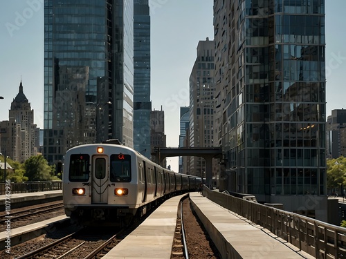 © claudunia, Naklejka premium Modern train moving through a cityscape of tall buildings.