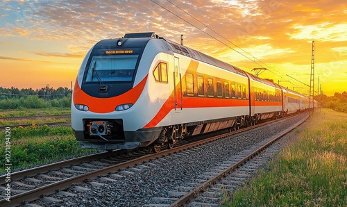 © SutikawatiVibes, Naklejka premium Modern train on railway at sunset
