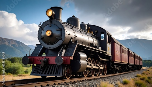 © penpak, Naklejka premium Modern train on railway tracks journeying through landscape locomotive traveling on rail network symbol of transport
