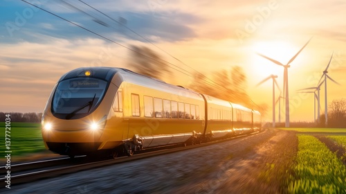 Fototapeta premium Modern Train Speeding Along Railway Tracks at Sunset with Wind Turbines in a...