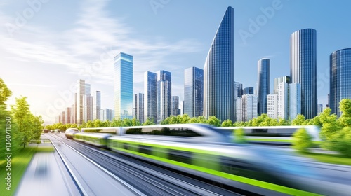 Obraz premium Modern train speeding through a futuristic cityscape with skyscrapers and greenery