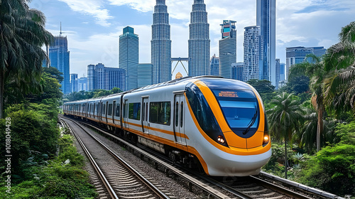 © Siasart Studio, Naklejka premium Modern train traveling through a cityscape with skyscrapers.