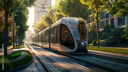 © Vectonessa, Naklejka premium Modern tram in a sunlit urban area with greenery