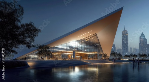 © Fauzi, Obraz premium Modern triangular building at dusk, reflecting in water, city skyline in background