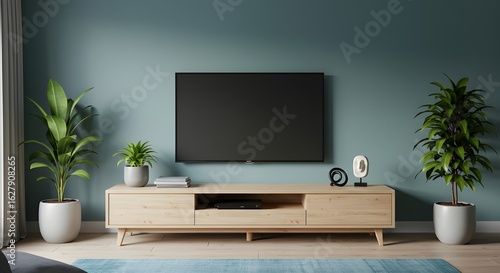 © Zikri, Fototapeta premium Modern TV console with houseplants and minimalist decor