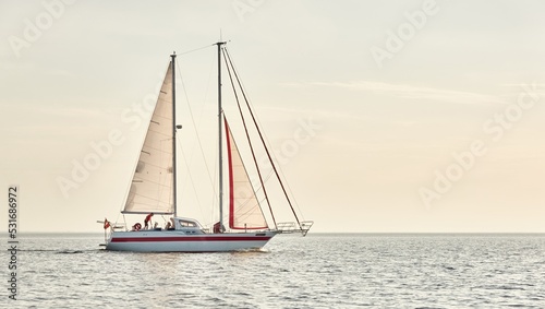 Fototapeta premium Modern two masted sailboat sailing in the Baltic sea on a clear day. Transportation, yacht cruise, yachting, regatta, sport, recreation themes. Travel, exploring, wanderlust concepts