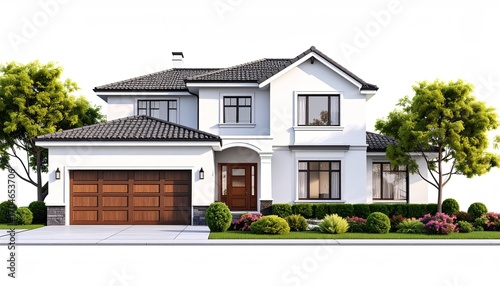 © Indra, Obraz premium Modern two-story house with dark gray roof, light facade, and landscaping