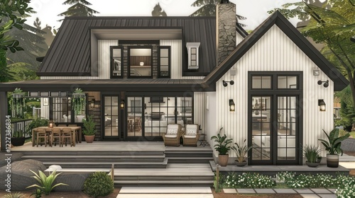 © Tina, Obraz premium Modern two-story house with large windows, surrounded by greenery and outdoor seating area