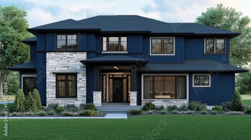© ShinneProject, Obraz premium Modern two-story house with navy blue siding, stone accents, and large windows.