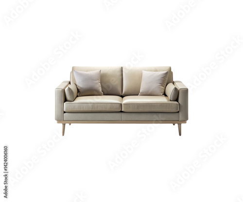 Fototapeta premium Modern twoseater sofa with light beige leather and two throw pillows