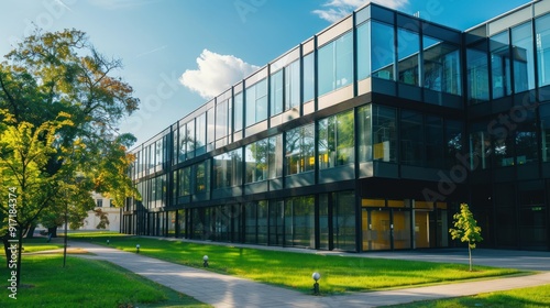 © Wattana, Obraz premium Modern university building with glass facades and green spaces.