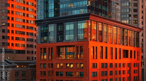 © Nur, Fototapeta premium Modern urban architecture bathed in sunset orange light