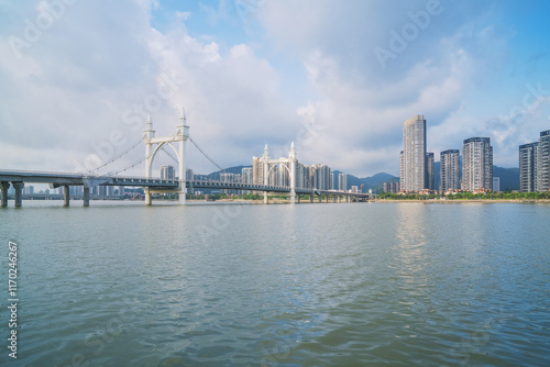 Fototapeta premium Modern urban architecture, bridges, and coastal scenery in Zhuhai, Guangdong...