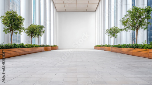 Fototapeta premium Modern urban atrium with symmetrical planters and trees offering calm minimalist space