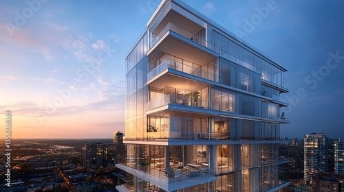 © THUA, Obraz premium Modern urban condo detail flat design with warm-toned accents sharp angles and soft reflections of the blue sky on glass balconies.