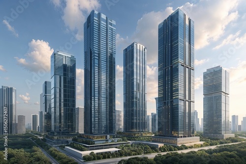 Fototapeta premium Modern Urban Design Featuring Sky-High Corporate Tower Clusters