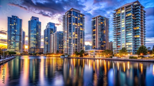© Wanlop, Naklejka premium Modern urban high-rise condominium buildings with sleek architectural design and vibrant city lights reflecting off the water at dusk in a bustling metropolis.