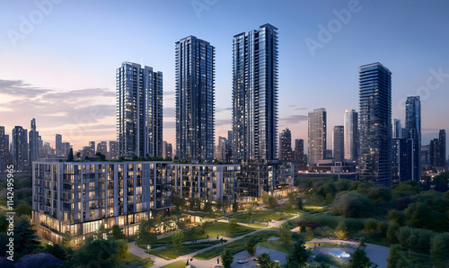 Obraz premium Modern urban landscape featuring high-rise buildings and green spaces at dusk.