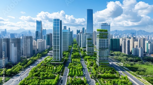 Obraz premium Modern Urban Landscape Showcasing Sustainable Architecture and Green Spaces...