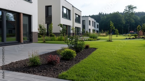 Naklejka premium Modern Urban Living: Stylish Townhouses with Tall Windows and Symmetrical...