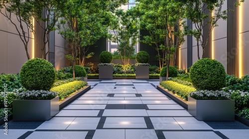 Fototapeta premium Modern urban oasis: Evening view of a tranquil courtyard garden with geometric pathways and lush greenery
