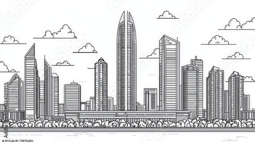 © Sukkamon, Fototapeta premium Modern Urban Skyline Illustration with Towering Buildings and Cloudy Sky in Black and White Style