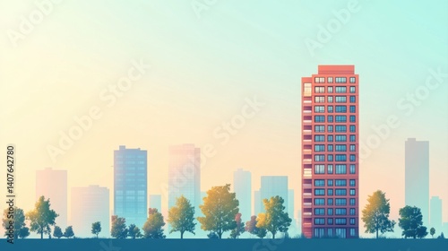 Fototapeta premium Modern Urban Skyline with a Stylish Building Surrounded by Nature and a Pastel Sunset Background