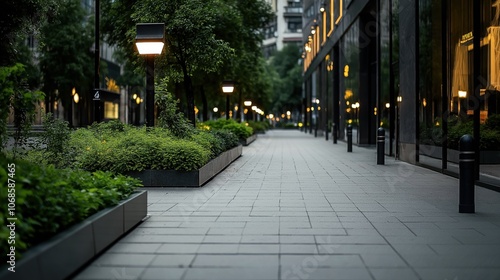 Fototapeta premium Modern urban walkway with illuminated street lamps and lush green plants along paved sidewalk