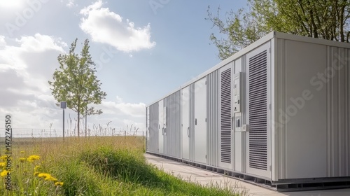 © Mira, Obraz premium Modern utility storage containers in natural landscape under clear sky
