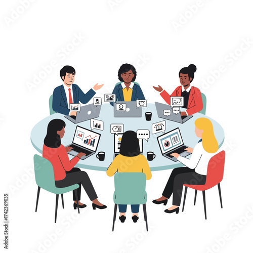 Obraz premium Modern Vector Illustration of Diverse Business People Collaborating Around Table with Laptops