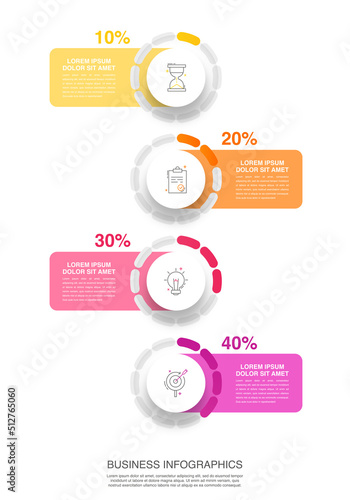 © evseev_tim, Fototapeta premium Modern vector infographics design template. Concept with 4 steps, labels. Creative timeline with graph elements, percentage circles and icons. Performance analysis in percent