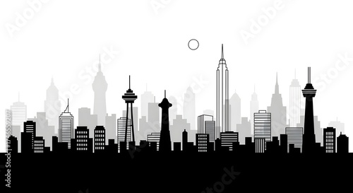 © Whisnu, Fototapeta premium Modern vector skyline in line-art style with towers and clean outlines, ideal for minimalist projects and presentations.