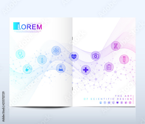 © BAIVECTOR, Fototapeta premium Modern vector template for brochure, leaflet, flyer, cover, catalog in A4 size. DNA helix, DNA strand, molecule or atom, neurons. Abstract structure for Science or medical background