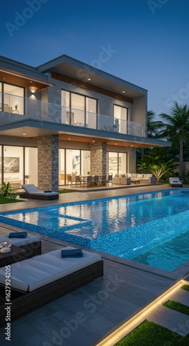 © coli, Fototapeta premium Modern Villa by Pool at Dusk