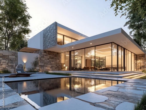 Fototapeta premium Modern villa exterior with stone pool area minimalist design and sleek glass...