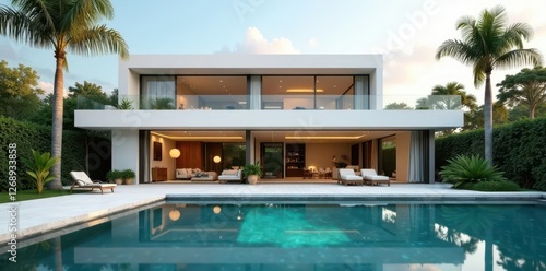 Obraz premium Modern villa, minimalist design, sleek lines, pool, glass, royalty free