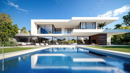 © artbot, Fototapeta premium Modern villa with a pool, surrounded by greenery and a clear blue sky.