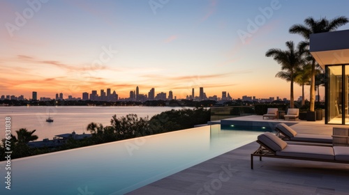 Fototapeta premium Modern villa with a private rooftop infinity pool overlooking the Miami...