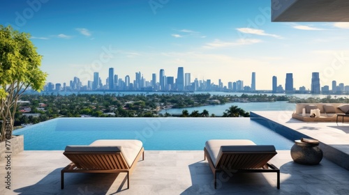 Fototapeta premium Modern villa with a private rooftop infinity pool overlooking the Miami skyline in Florida