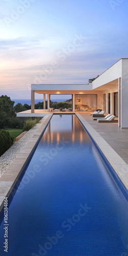 © JuanM, Fototapeta premium Modern villa with infinity pool at sunset overlooking scenic landscape