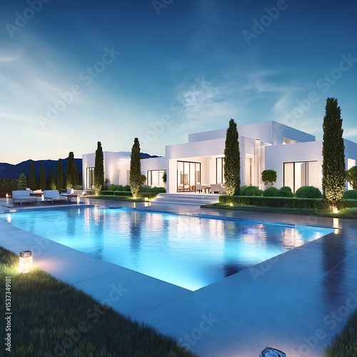 © Les, Fototapeta premium Modern villa with pool at twilight