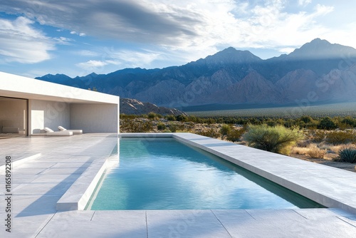 Obraz premium Modern villa with pool overlooking mountains in desert landscape during...